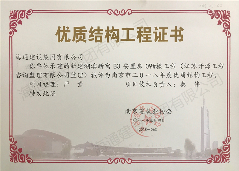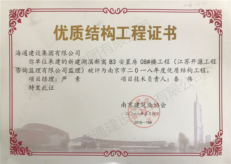 南京市優質結構2018-新建湖濱新寓B3安置房08#樓工程