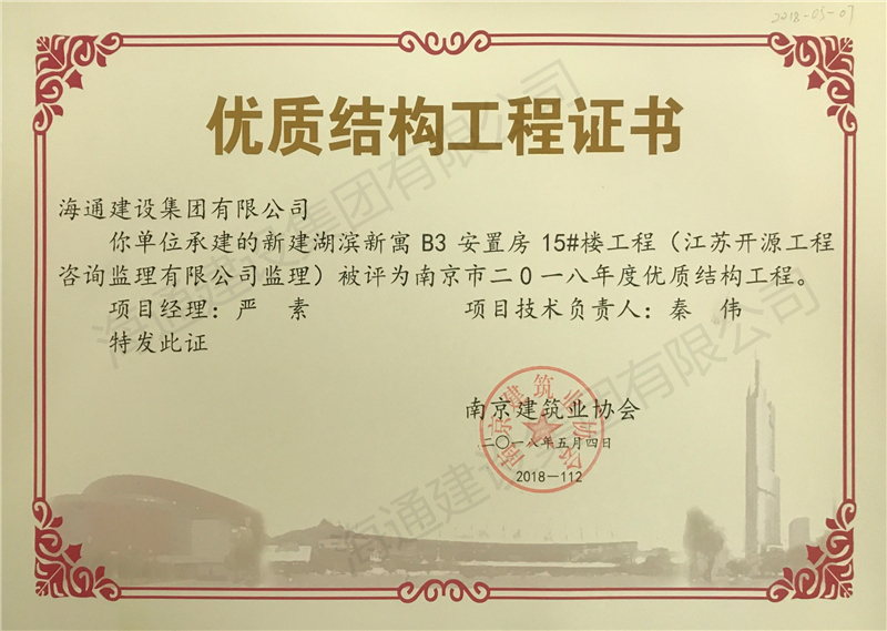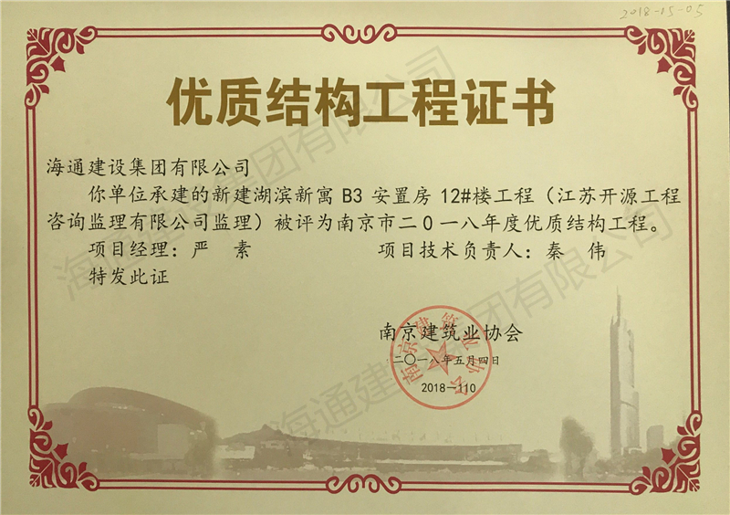 南京市優質結構2018-新建湖濱新寓B3安置房15#樓工程