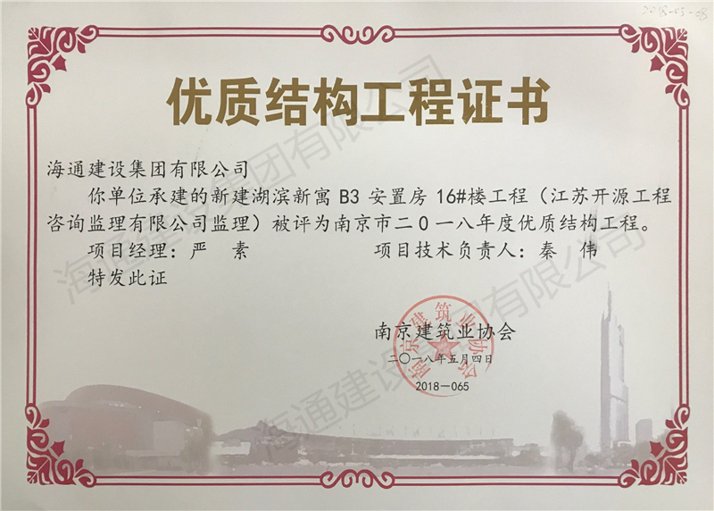 南京市優質結構2018-新建湖濱新寓B3安置房16#樓工程