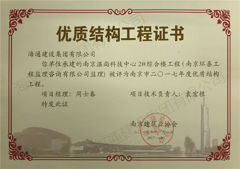 南京市優質結構2017南京溫尚科技中心1#綜合樓工程