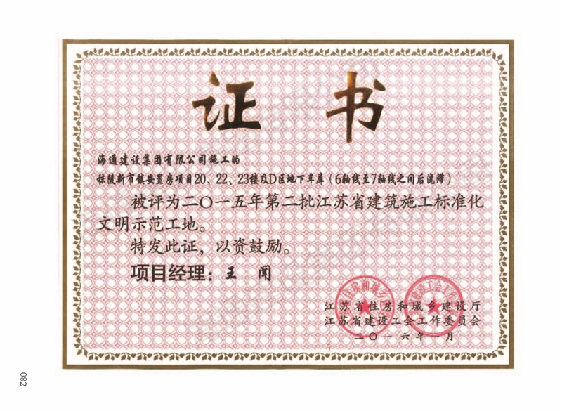 江蘇省文明工地2016(秣陵新市鎮安置房項目20.22.23樓及D區地下車庫)