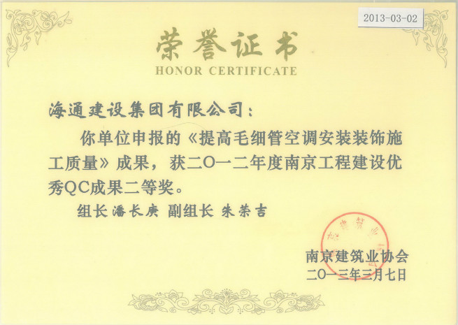 2012年啊度南京工程建設優秀QC成果二等獎