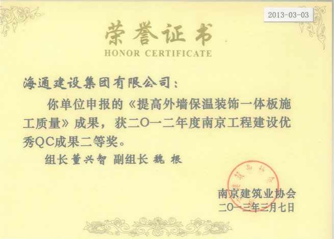 2012年啊度南京工程建設(shè)優(yōu)秀QC成果二等獎