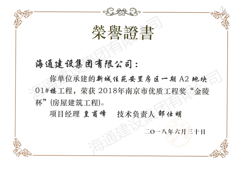 南京市金陵杯2018新城佳苑安置房區一期A2地塊01#樓工程