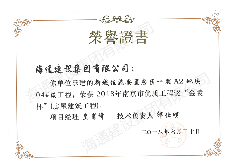 南京市金陵杯2018新城佳苑安置房區(qū)一期A2地塊04#樓工程