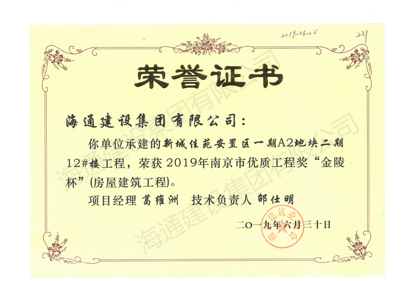 南京市金陵杯2019新城佳苑安置區(qū)一期A2地塊12#樓工程