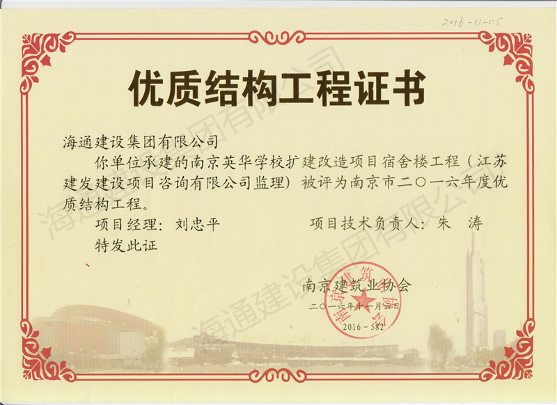 南京市優質結構2016南京英華學校擴建改造項目宿舍樓工程