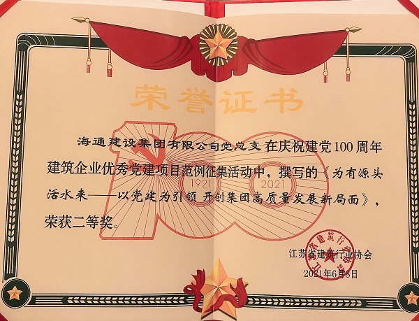 上半年,為表彰海通集團黨總支的優異工作成績,中共南京江寧高新區工作委員會授予 “江寧高新區四星級基層黨組織”榮譽稱號,激發了全體黨員的信心和集體榮譽感。7月份,在江蘇省建筑行業協會組織的“慶祝建黨100周年建筑企業優秀黨建項目范例征集”活動中,海通集團黨總支以《為有源頭活水來——以黨建為引領 開創集團高質量發展新局面》為題的黨建范例得到省建筑行業協會的好評,榮獲二等獎。同時,該項目范例被中國施工企業管理協會評為中國工程建設企業黨建工作優秀案例,這是對海通集團黨總支黨建工作的極大肯定和褒獎。